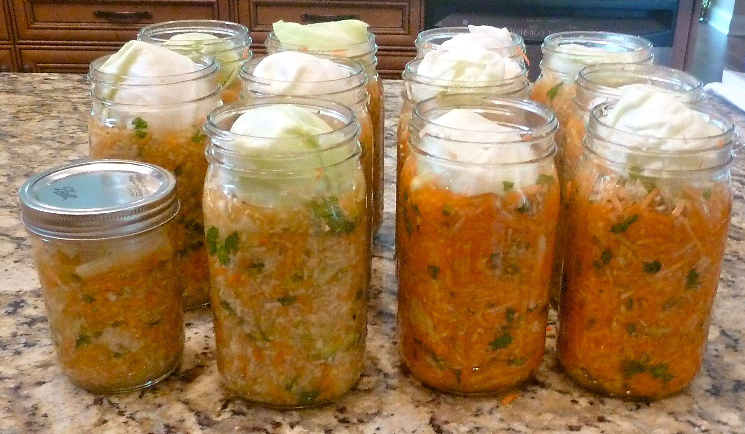 - Tightly pack the vegetables into the mason jars using your fist, leaving at least 2 inches of space at the top of the jars. Dip the cabbage leaves into some brine, roll them, and wedge them into the jars to force the shredded veggies below the surface of the brine. Twistthelidson to the jars very tightly.