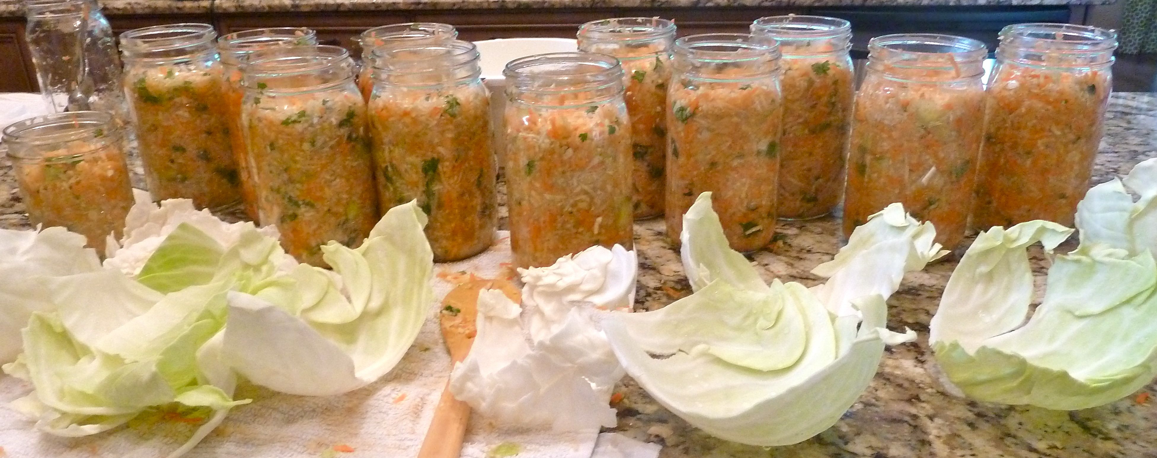 - 1 large or 2 small heads of cabbage, washed (make sure to hold aside at least one leaf of cabbage for each jar of cultured veggies)